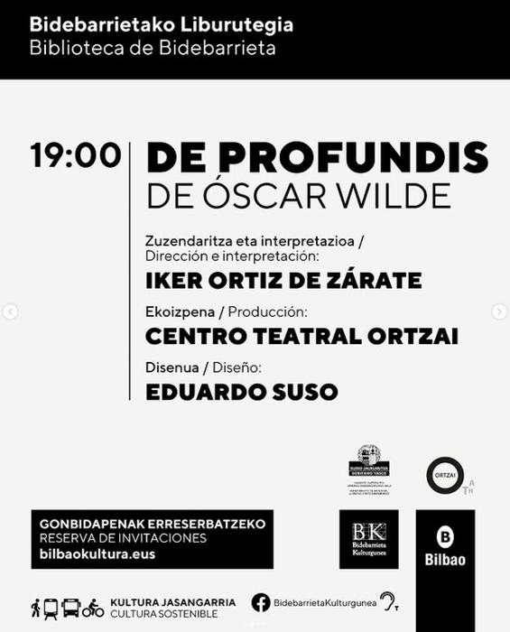 Bilboko Bidebarrieta Kulturgunean. |Antzerkia2025ean, Oscar Wilde hil zala 125 urte bete dira, eta, horregaitik, Iker Ortiz de Zaratek haren lehen lanetako bat berreskuratu dau: De Profundis bakarrizketea.