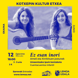 Lemoako Kotxepin Kultur Etxean. |BestelakoakIpuin kontaketa musikatua. Amaia Elizagoyen ipuin kontalaria eta Irati Celestino musikaria.