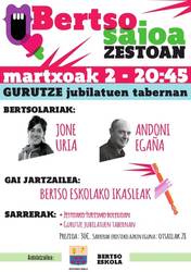 Zestoako Gurutze jubilatuen tabernan. |Bertsolaritzea- Bertsolariak: Jone Uria eta Andoni Egaña.