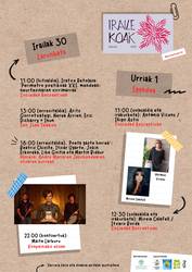 - 11:00etan: Antònia Vicens poetearen eta Iñigo Astiz kazetariaren arteko barriketaldia. 15 minutuko atsedenaren ostean, Mireia Calafell poetearen eta Itxaro Borda euskaltzain osoaren arteko solasaldia (Sociedad recreativan).