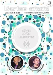 - 19:00etan, auditorioan, bertso emonaldia. Bertso eskola izango du gai ekitaldiak. Nerea Ibarzabal bertsolaria, eta Aulki Jokoa saioan aurkezle ezagutu genuen Edurne Azkarate ibili dira prestaketa lanetan. Kantuan izango dira Beñat Gaztelumendi, Julio Soto, Maddalen Arzallus, Maialen Lujanbio eta Xabat Gallatebeitia bertsolariak.