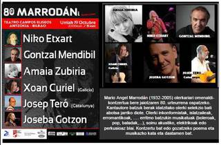 Bilboko Arteria Campos Eliseos Antzokian |MusikeaMarrodani kantatzen. NIKO ETXART + GONTZAL MENDIBIL + AMAIA ZUBIRIA + XOAN CURIEL (Galizia) + JOSEP TERÓ (Catalunya) + JOSEBA GOTZON